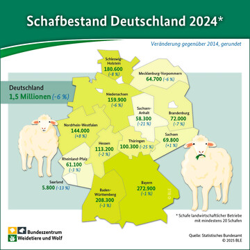 Die Wolfsbestände in Deutschland sind in den vergangenen Jahren stark gewachsen. Insgesamt stieg die Anzahl Wölfe von 268 Individuen im Monitoringjahr 2014/15 auf 1633 Tiere im Monitoringjahr 2024/25. Innerhalb von zehn Jahren entspricht das einem Zuwachs um gut 500 Prozent oder um 1365 Wölfe. *