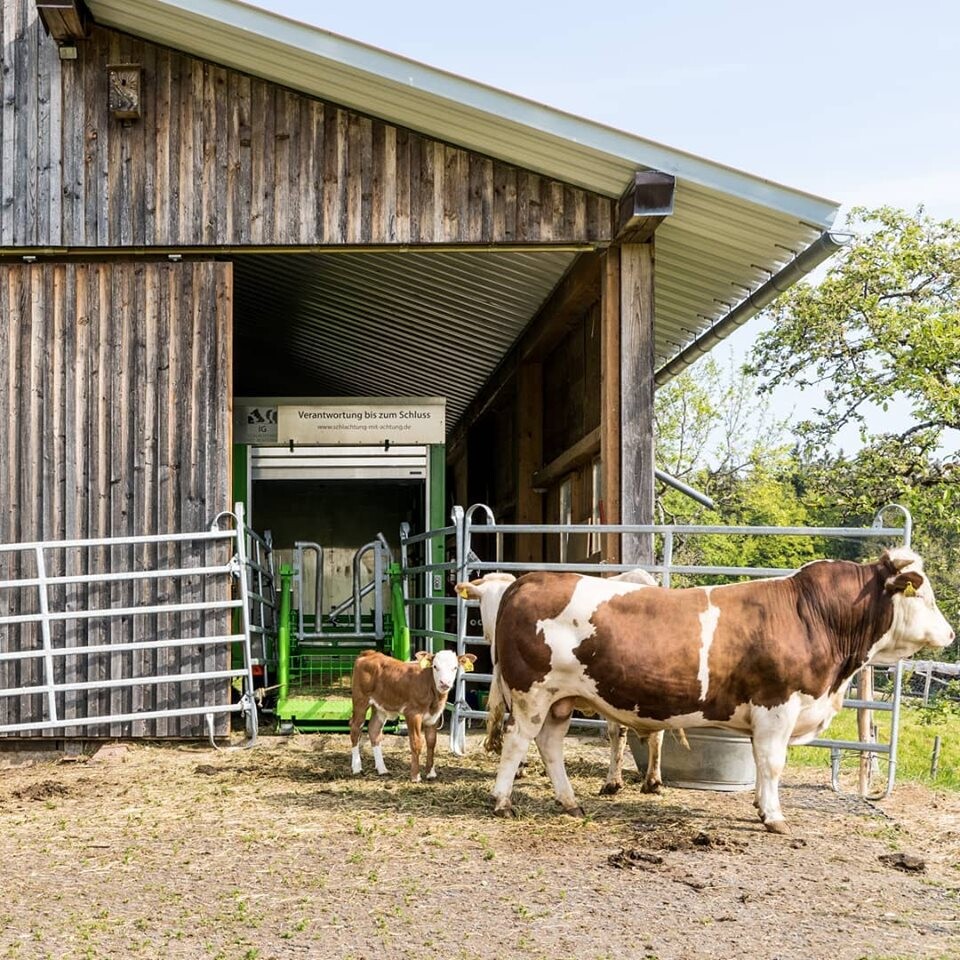 Ein Tod mit möglichst wenig Leid will Sandra Kopf Rindern ermöglichen. Zusammen mit Thomas Mayer rief sie im Januar 2015 die Interessengemeinschaft (IG) Schlachtung mit Achtung ins Leben. Gemeinsam mit Metallbaumeister Peter Brandmeier entwickelten sie eine mobile Schlachteinheit (MSE), die es ermöglicht, Rinder direkt auf dem Hof zu schlachten. So entfallen Verladen und Transport, beides ist häufig mit großem Stress für die Rinder verbunden. Stattdessen betritt das Tier freiwillig, angelockt durch Futter, die Fangeinheit. Hebt es am Fressgitter den Kopf, schließt sich der Bügel und das Tier ist fixiert. Per Bolzenschuss wird es dann betäubt. Mit Hilfe einer Seilwinde wird die Fangeinheit schließlich in die mobile Schlachtanlage gezogen. Ein Rolltor schließt sich und es folgt der Blutentzug. 60 Sekunden darf das Ganze laut Vorschrift dauern. „Wir schaffen das oft sogar in unter 45 Sekunden“, sagt Sandra Kopf. Rund 100 Rinder wurden mittlerweile mit der MSE geschlachtet.