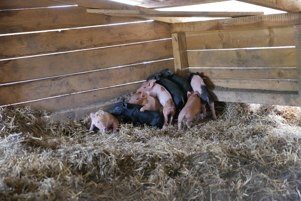 Alle Zuchtschweine leben in einem von den Mastschweinen getrennten Areal ganzjährig draußen. Als Schutz vor Wind und Wetter dienen – wie bei den anderen Schweinen auch – Holzhütten mit Stroh darin. Die Tiere lassen sich problemlos anfassen und bleiben auch zum Abferkeln in der Gruppe, inklusive Eber. Das Abferkeln läuft generell gut. „Ferkelverluste durch Erdrücken liegen eher am Verhalten der Sau“, erklärt Ben, „manche weisen gar keine Verluste auf, andere stellen sich ungeschickt an und werden dann nicht weiter zur Zucht eingesetzt.“