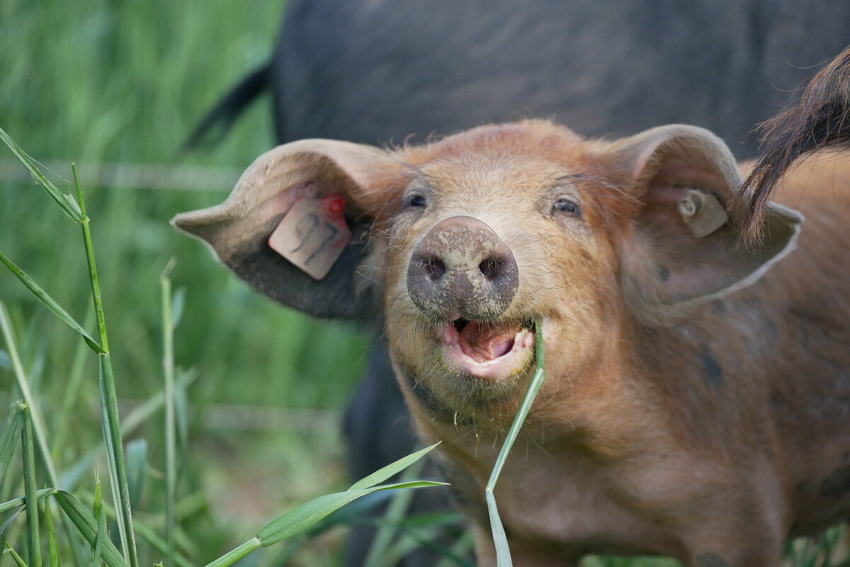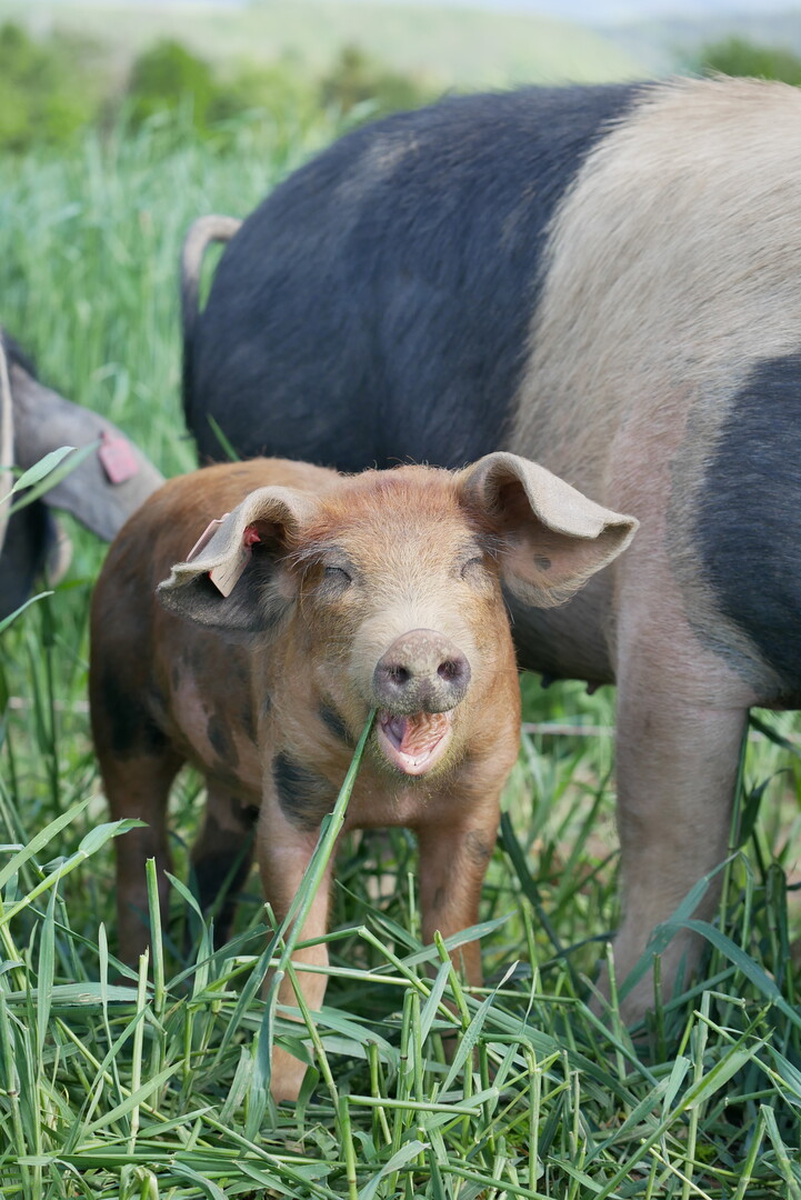 Sie sind weiß mit schwarzen Flecken, rosa mit schwarzem Kopf und Hinterteil, schwarz wie Wildschweine oder haben rotbraune wollartige Borsten. Ihre Rüssel wühlen hingebungsvoll im Dreck und wenn sie gerufen werden, beweisen sie, dass 100 kg Körpergewicht nicht zwangsläufig eine träge Masse sind. „Kommt, Schweine, kommt“, ruft Ben Berthold und im Schweinsgalopp geht es ins frische Grünfutter, wo die Tiere sofort anfangen laut zu schmatzen. Seine Frau Johanna wird belagert von drei großen weißen Hunden, die sich ihre Streicheleinheiten abholen und die dreijährige Tochter Ida beobachtet fasziniert, wie herrlich Schweinekot unter den Gummistiefeln haftet. Im nächsten Moment springt sie einem der Ferkel hinterher. Schweine, die Sommer wie Winter in einer gemischten Gruppe vom Ferkel bis zum Schlachtschwein im Freien leben, viel Platz haben und täglich weiden können – das ist, was Johanna und Ben Berthold sich unter vernünftiger und artgerechter Tierhaltung vorstellen.