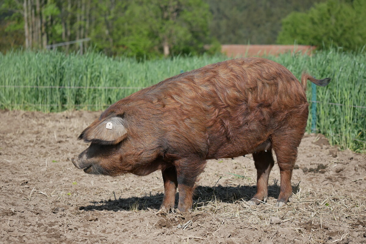 Die Wurfgröße liegt im Mittel bei vier bis sieben Ferkeln, das ist deutlich weniger als bei hochgezüchteten Rassen, hat aber den Vorteil, dass die Muttersau alle Ferkel problemlos mit Milch versorgen kann. Mit sechs bis acht Wochen werden die Ferkel abgesetzt und kommen in die Gruppe der Mastschweine. Dort leben sie in einer Gruppe von rund 120 Schweinen auf einem acht Hektar großen Gelände.