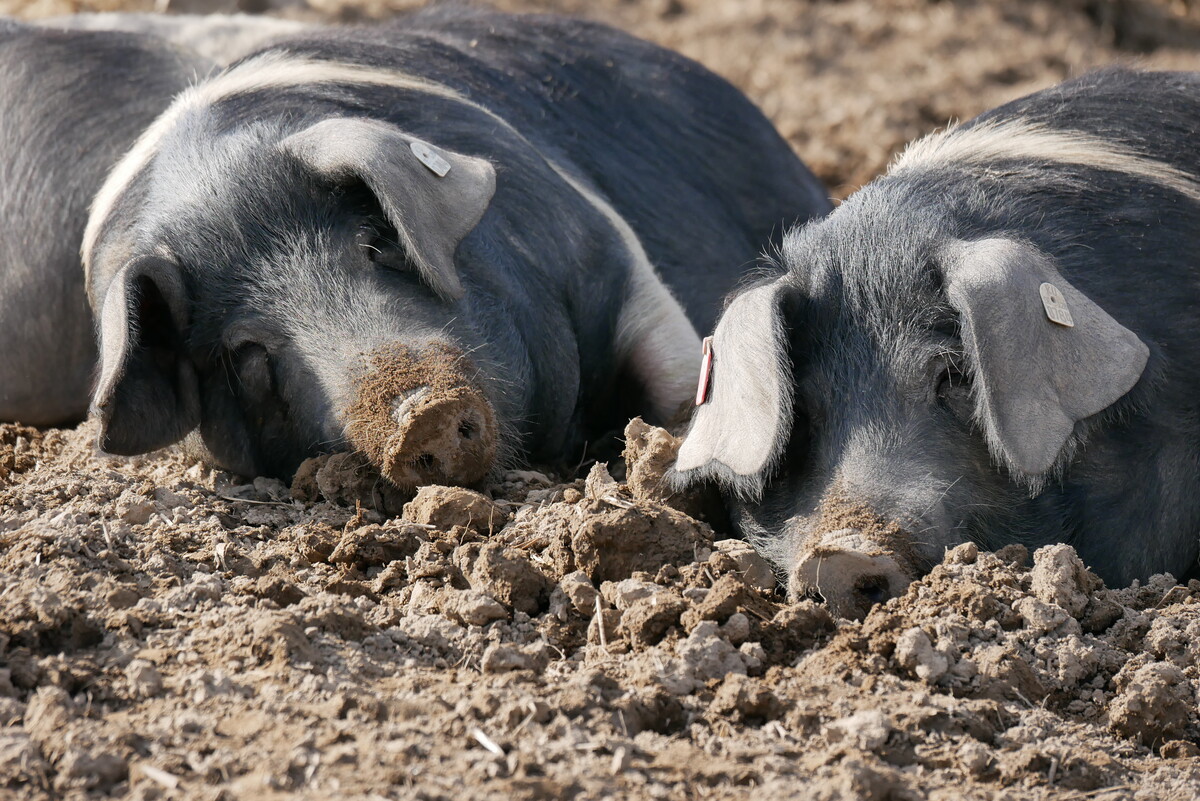 Mangalica-Wollschweine als eine der ältesten Schweinerassen sind bekannt für ihre hervorragende Fleischqualität und ihr intramuskuläres Fett, das als Geschmacksträger dient. Für Kunden, die etwas fettärmeres Fleisch bevorzugen, haben die Bertholds Bunte Bentheimer, Schwäbisch-Hällische und Duroc eingekreuzt. Deren Fleisch ist deutlich magerer und trotzdem von hoher Qualität. Die Unterschiede der Rassen zeigen sich nicht nur im Fleisch, sondern auch in Verhalten, Futterbedarf und Wachstum. So sind Bentheimer und Schwäbisch-Hällische sehr sanftmütig, Wollschweine dagegen haben mehr Urinstinkte und sind im Umgang ruppiger, außerdem sind sie kompakter und wachsen langsamer.