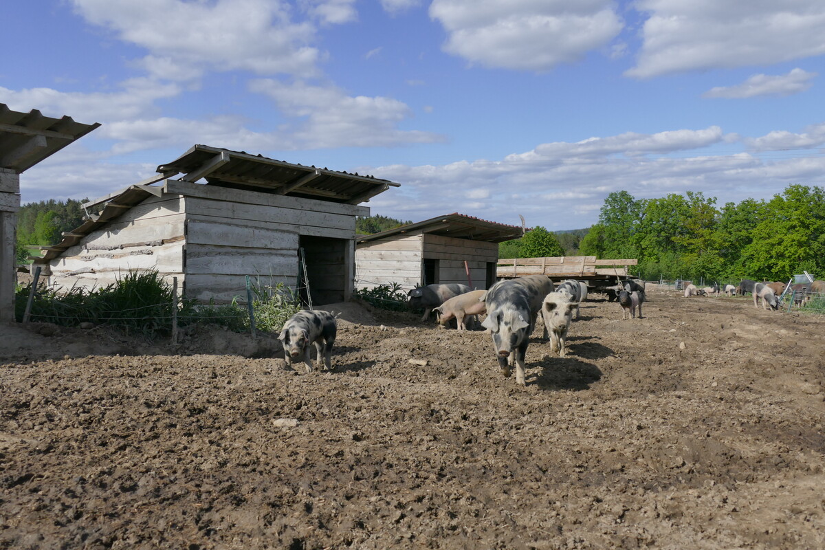 Auf ihrem Hof in Eggenreuth bei Kulmbach erzeugen sie auf diese Weise Fleisch besonderer Qualität, das unter dem Namen „Kulmbacher Weideschwein“ im hofeigenen Laden verkauft wird. Das Besondere dabei ist, dass Zucht, Mast und Direktvermarktung in einer Hand liegen und dadurch Tiertransporte vermieden werden. Beide sind Quereinsteiger in der Landwirtschaft. Ben ist ausgebildeter Physiotherapeut und Yogalehrer und hat auf dem Hof einen Raum für seine wöchentlichen Yogakurse eingerichtet. „Yogalehrer sind ja eigentlich meistens Vegetarier“, erzählt er lachend, „aber wir züchten und vermarkten Schweine“. Johanna ist studierte Sozialpädagogin und derzeit in Elternzeit für die beiden Töchter Ida und Lotta. Schon in der Jugend haben beide in der Landwirtschaft geholfen und auf verschiedenen Höfen Erfahrungen gesammelt. Zusätzlich hat Ben seine Kenntnisse nebenher im BiLa-Programm vertieft.