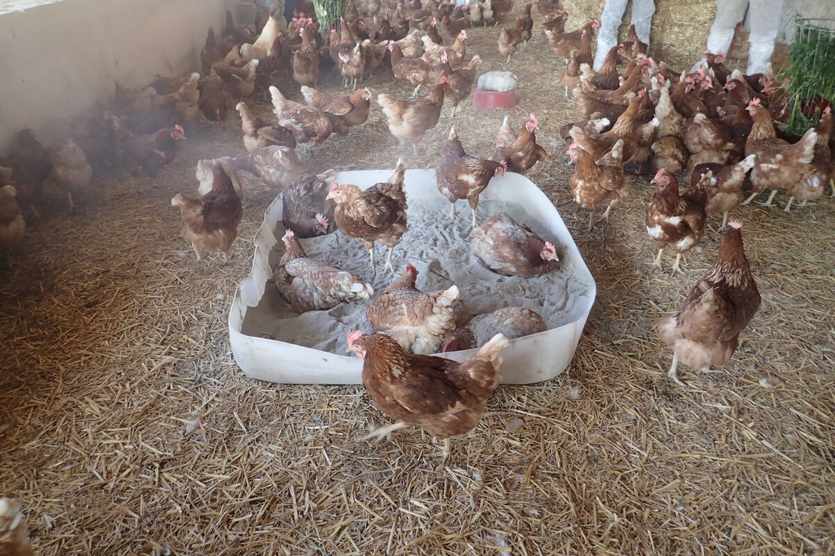 Wichtig für das Wohlbefinden des Geflügels ist auch das Staubbaden. „Hühner wollen jeden oder jeden zweiten Tag staubbaden. Am besten gemeinsam“, erklärt Keppler. Denn Staubbaden ist auch eine soziale Aktion. Für ein wohliges Staubbad sollte man ein spezielles Substrat zur Verfügung stellen, zum Beispiel Sand oder eine Mischung aus Sand und Gesteinsmehl. Diese Mischung beugt Milben vor und staubt im Gegensatz zu reinem Gesteinsmehl weniger. Die Einstreu eignet sich dagegen weniger als Staubbad. Denn sie ist meist nicht trocken genug und erst recht nicht pulvrig. „Wenn man ein Substrat zur Verfügung stellt, dann wird das IMMER intensiv genutzt!“, betont Keppler.