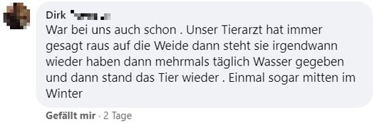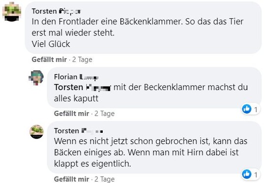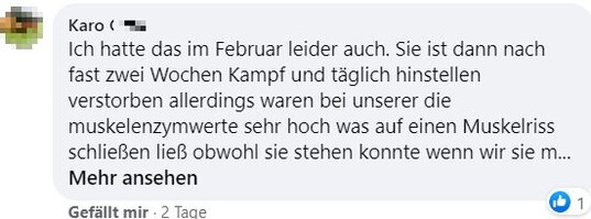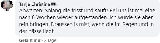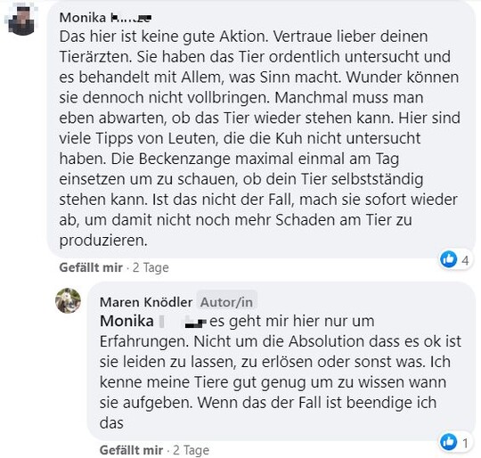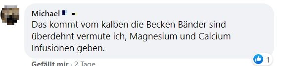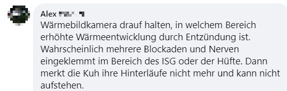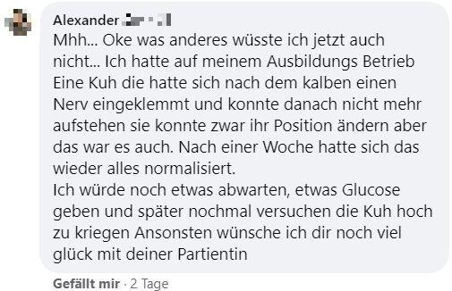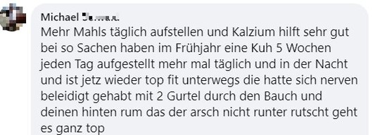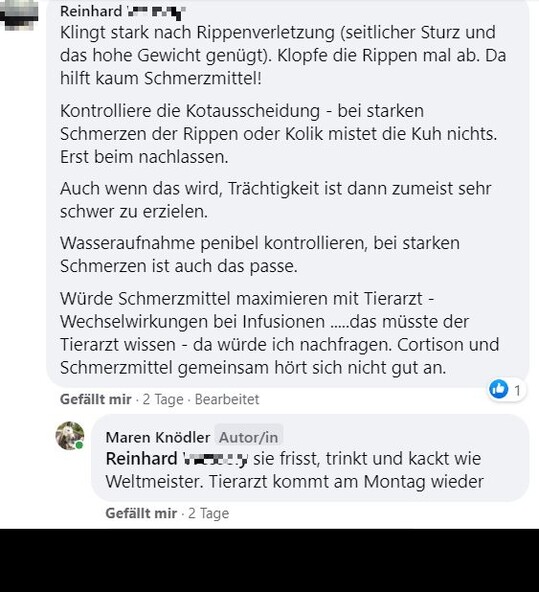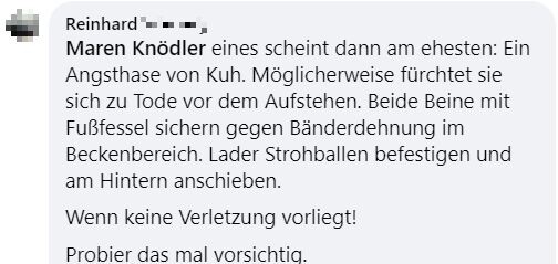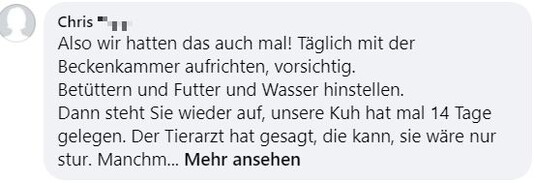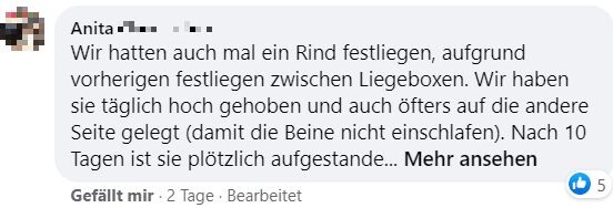 "Hallo zusammen, ich bräuchte mal eure Erfahrungen. Unsere Kühe haben letzten Samstag gerindert. Beim aufeinander rumspringen muss eine irgendwie blöd gefallen sein und steht seither nicht mehr auf. Tierarzt war zweimal da und hat Infusionen gegeben und Schmerzmittel und Cortison gespritzt. Beine und Hüfte scheinen in Ordnung. Aufrichten mit dem Radlader bringt nichts. Ansonsten waren die Tierärzte tiefenenspannt und sagen, man muss halt abwarten. Jetzt liegt sie seitdem und es ist keine Besserung in Sicht. Drehen tut sie sich selber, frisst auch aber steht einfach nicht auf. Hatte das schonmal jemand? Gibt es Hoffnung, dass sich das wieder gibt? Bin sehr hilflos gerade und fühle mich vom Tierarzt hängen gelassen." schrieb Maren Knödler hilfesuchend in die Facebookgruppe "Landwirtschaft". Das Blut sei untersucht worden und in Ordnung.