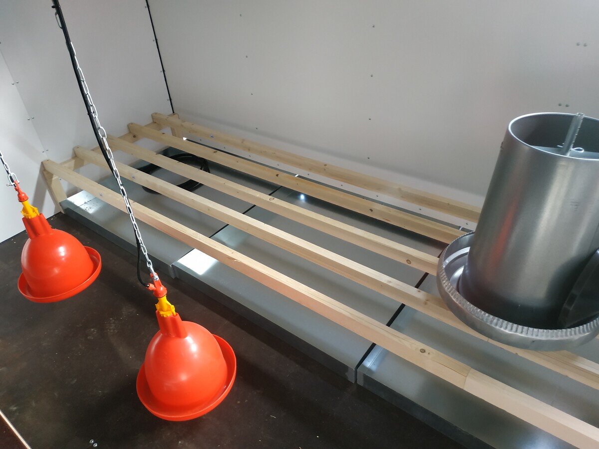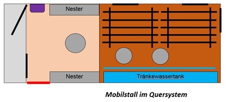 Vorteil dabei ist, dass die Stallhülle bereits vorhanden ist. Es empfehlen sich Kühlanhänger, da diese bereits isoliert sind. Die gängigen LKW-Kühlanhänger haben ein Innenmaß von etwa 7,30 m x 2,45 m = 17,8 m² und damit eine Kapazität von rund 105 Stallplätzen gemäß EU-Öko-Verordnung. Je nach Ausführung (Tandemachser oder Zweiachser mit Drehschemel) bietet sich zudem mit dem Bereich vor oder zwischen den Achsen eine Ausbaureserve von weiteren 7 bis 8 m², also 42 bis 48 Hennenplätzen. Diese zweite Ebene muss über Rampen mit der oberen Ebene verbunden werden und den Tieren ständig zugänglich sein, damit sie auf die Stallfläche angerechnet werden kann.